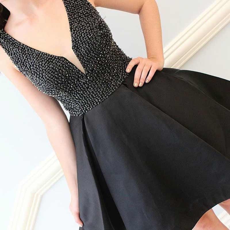 A-Line V-Neck Short Black Homecoming Dress with Beading