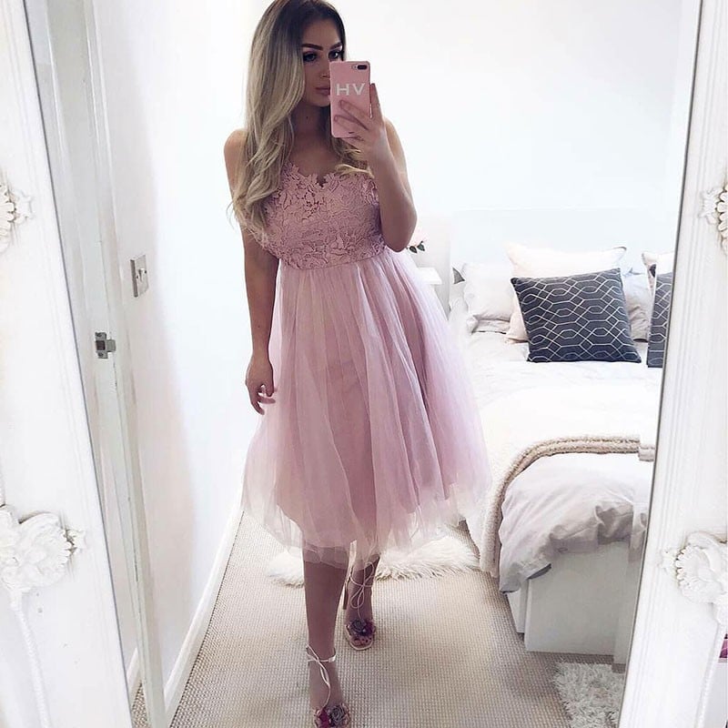A-Line Spaghetti Straps Knee-Length Pink Homecoming Bridesmaid Dress with Lace