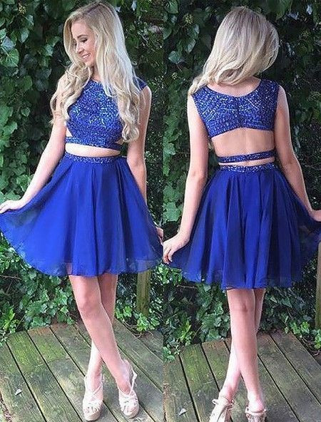 A-Line Two Piece Royal blue Chiffon Homecoming Dress with Beading