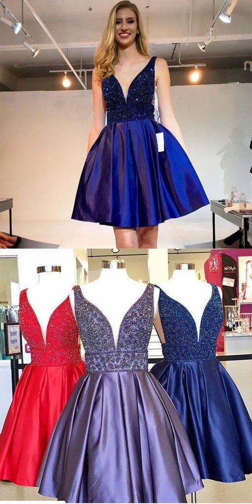 Cute Beaded Short Homecoming Dresses V-Neck Prom Dresses Knee Length Evening Formal Dresses