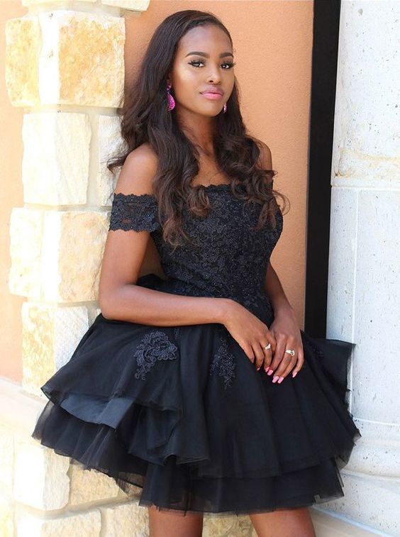 Unique A-Line Off the Shoulder Short Homecoming Dresses,Black Lace Hoco Dresses,Short Prom Dresses,Little Black Dresses,Classic Short Dresses