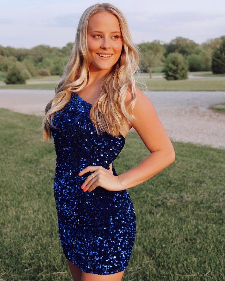 Sparkly Royal Blue One Shoulder Sequins Short Homecoming Dresses