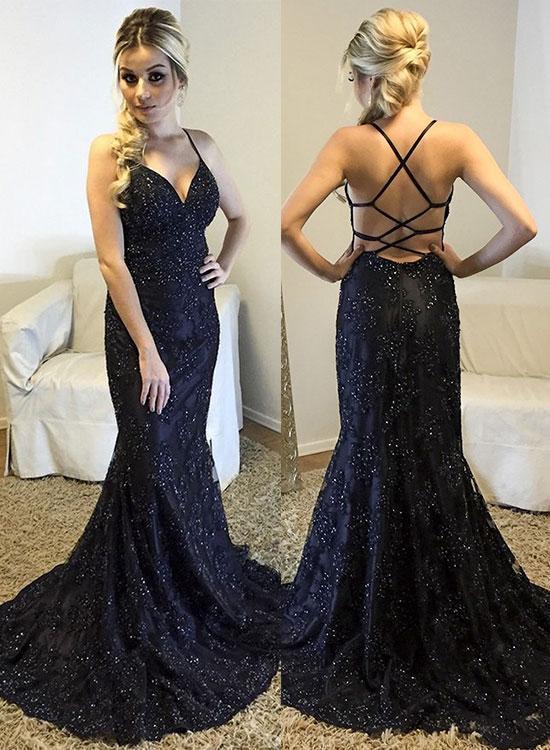 Sexy Black Lace V-Neck Long Prom Dress,Mermaid Evening Dress