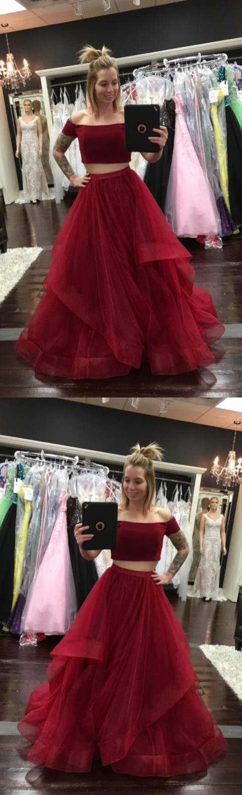 Off the Shoulder Two Piece Red Long Prom Dresses