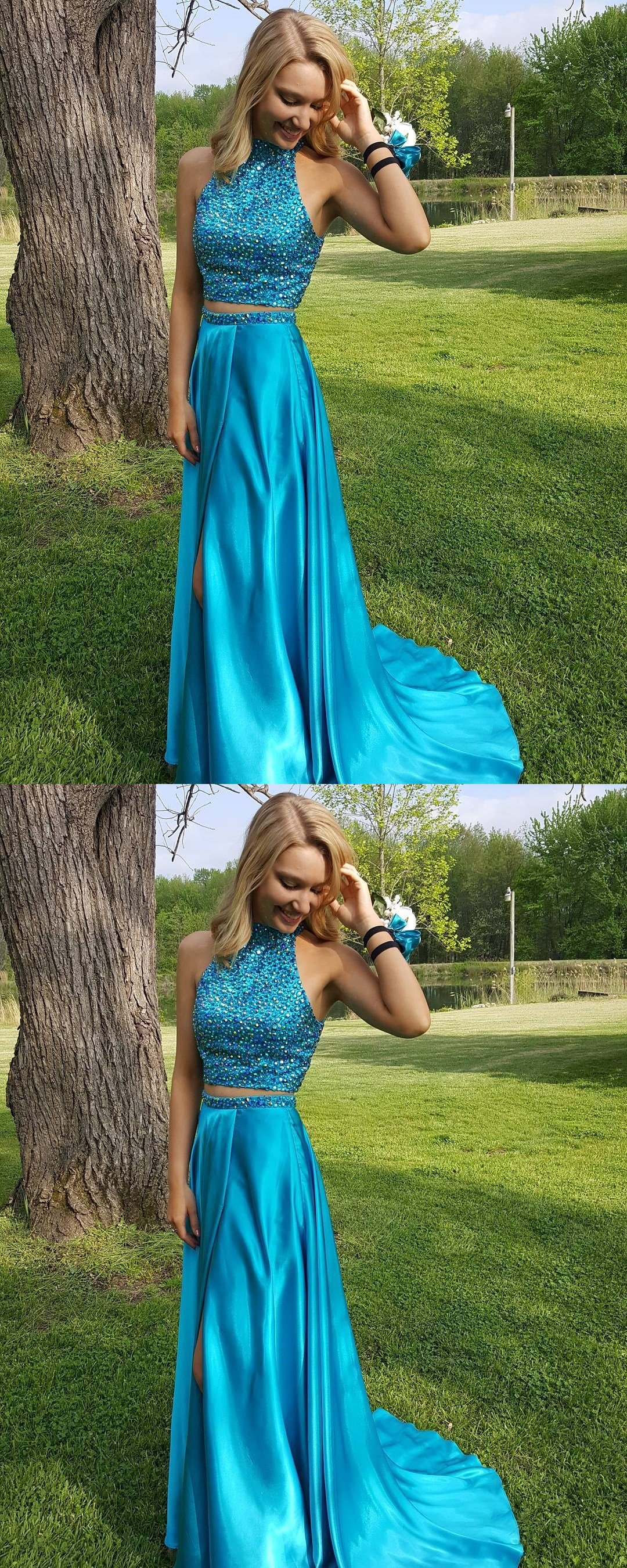 Two Pieces Sexy Halter Prom Dress Side Slit Party Dress Beading Evening Dress