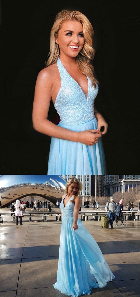 Blue Halter Deep V Neck Long Prom Party Dress with Beading