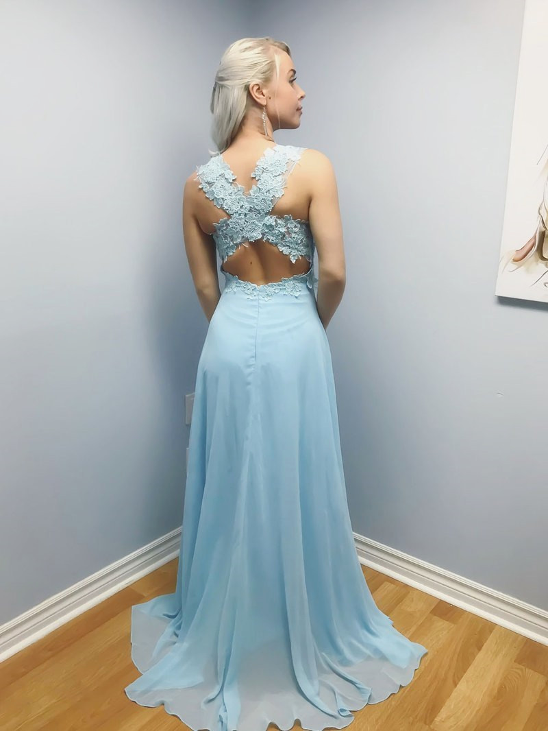 Long Sky Blue Formal Evening Dress Lace Bodice Cross Back Cheap Prom Dresses