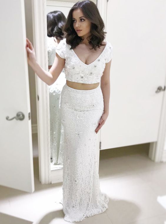 Charming Two Piece V Neck Cap Sleeve White Mermaid Long Prom Dress Beaded Lace Evening Party Dress