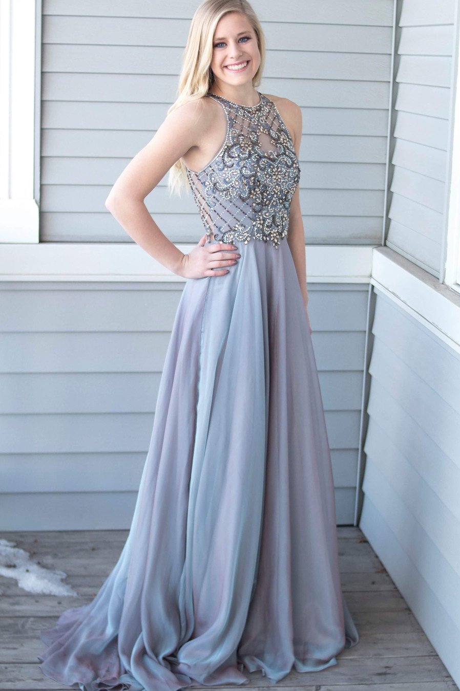 Charming Halter Long Prom Dress Beads Light Grey Evening Party Gown