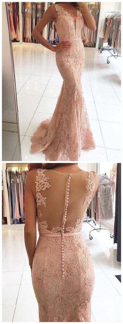 V-neck Mermaid Lace Long Prom Dresses with Sweep Train