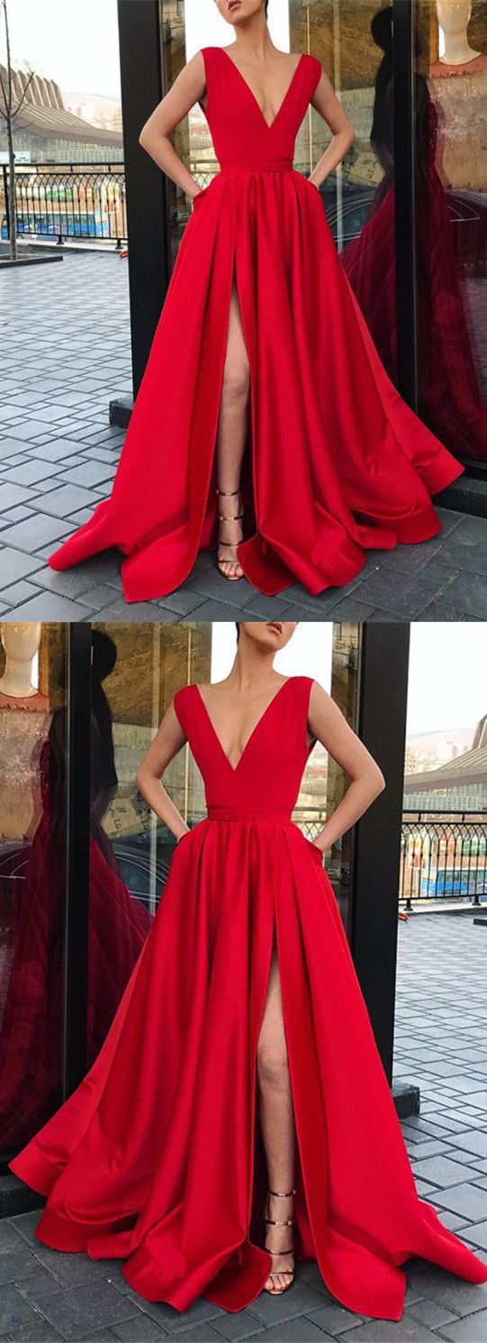 Deep V Neck Red Satin Long Homecoming Prom Dress with Pockets,Evening Party Gown