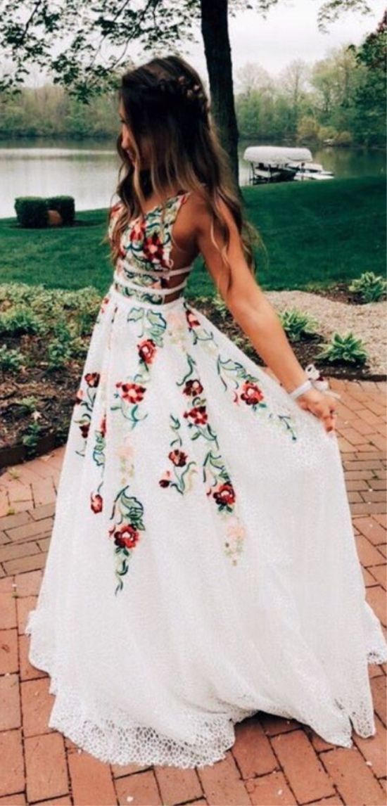 Unique A-Line Prom Dresses, White Lace Prom Dresses