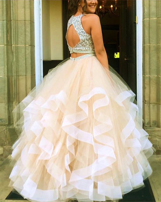 Champagne Two Piece Ball Gown Beaded Long Prom Dresses