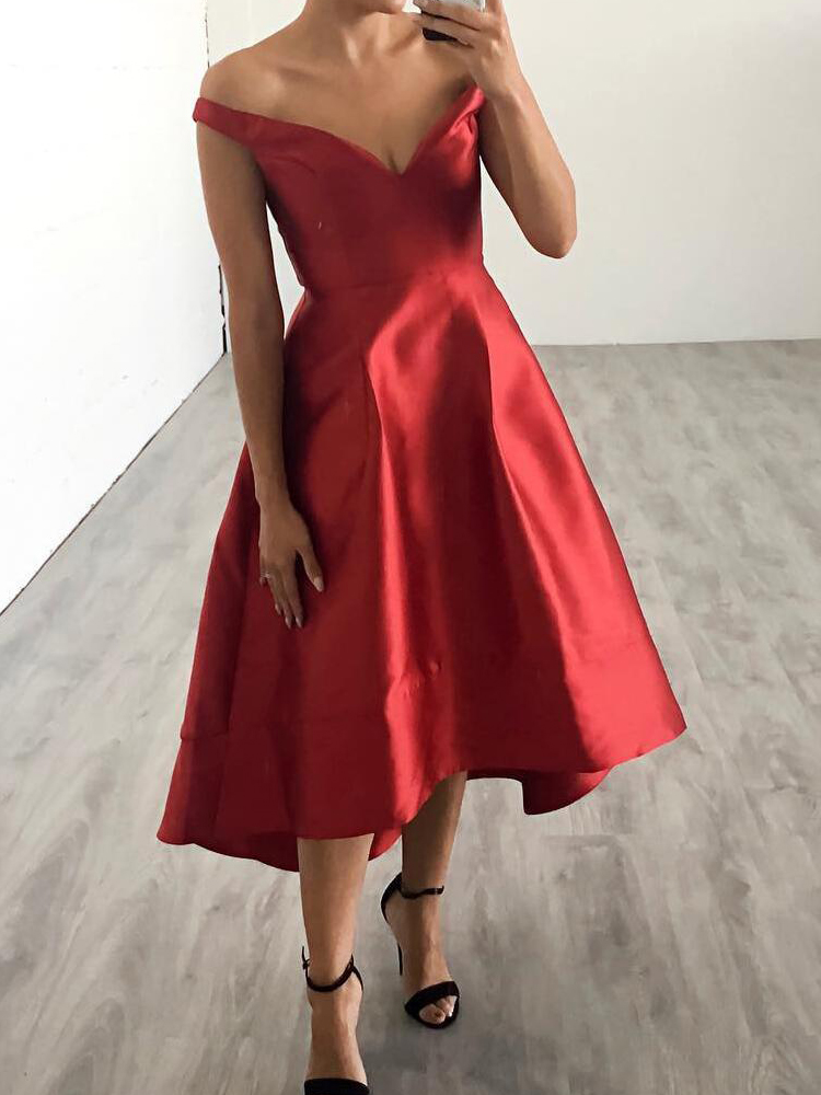A-Line Red Satin Off the Shoulder Open Back High Low Prom Dresses,Evening Party Dresses