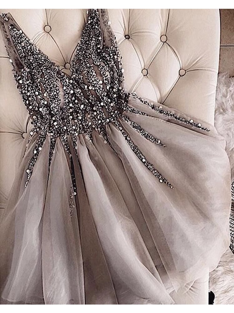 V Neck Grey Short Homecoming Dress,Beading Sparkly Homecoming Dresses