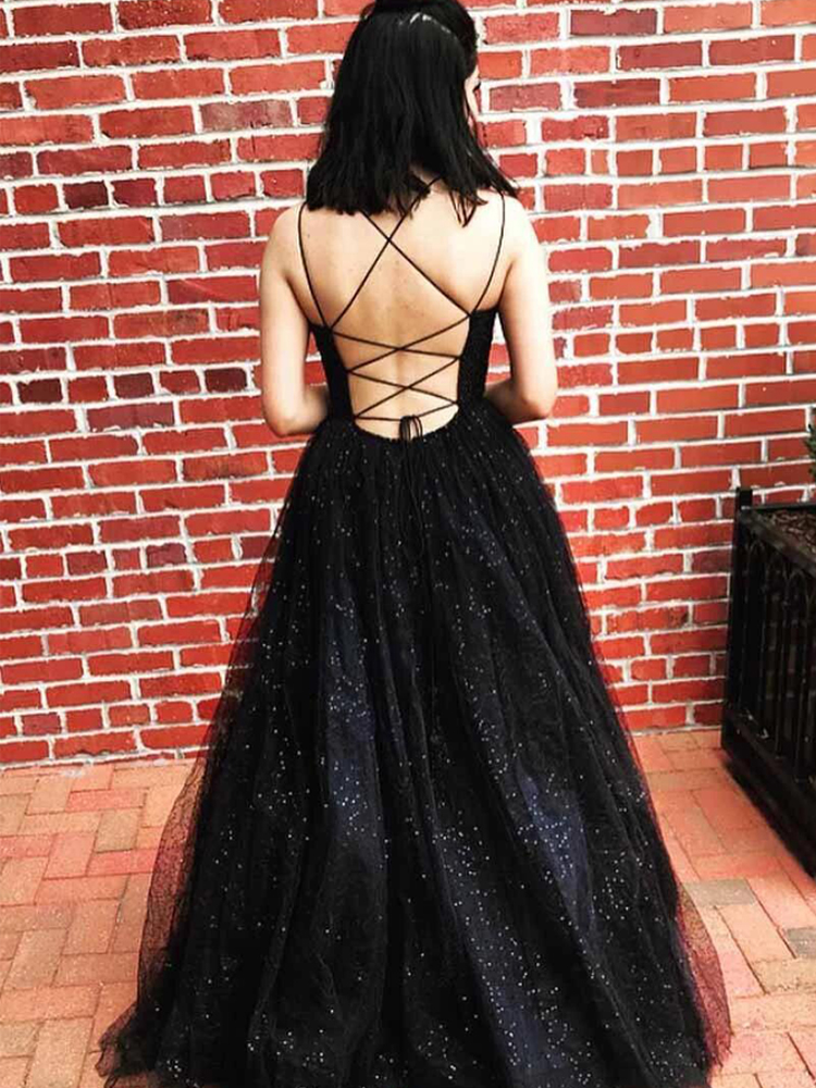 Stunning A-Line Scoop Neck Cross Back Black Sequins Tulle Long Prom Dresses,Evening Party Dresses