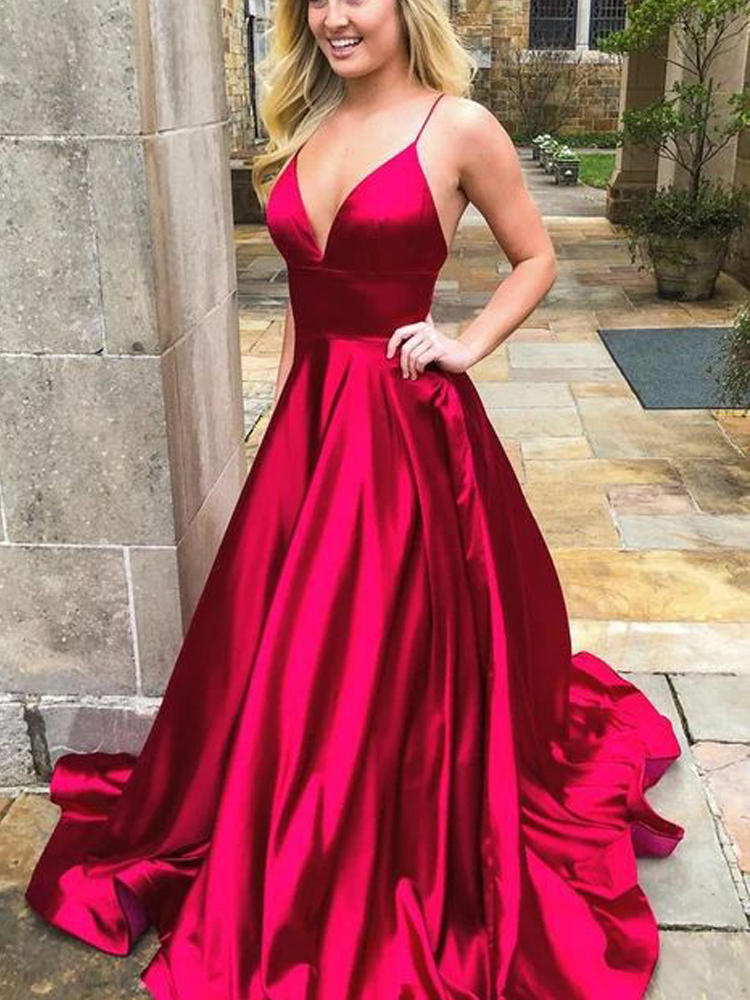 Simple Ball Gown V Neck Backless Spaghetti Strap Black Satin Long Prom Dresses,Formal Evening Party Dresses