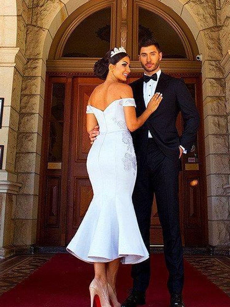 Mermaid Off the Shoulder Open Back Light Grey Satin Ankle Length Bridesmaid Dresses