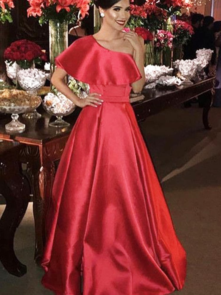 Gorgeous A-Line One Shoulder Open Back Red Satin Long Prom Dresses with Ruffle,Evening Party Dresses