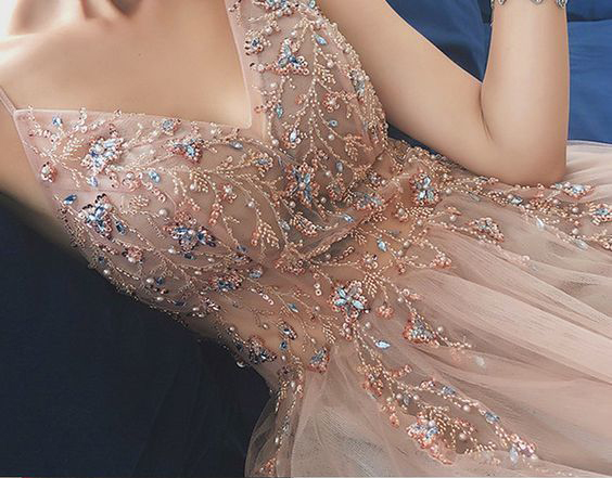 Cute V Neck Spaghetti Straps Blush Pink Prom Dresses with Beading, Split Evening Party Dresses
