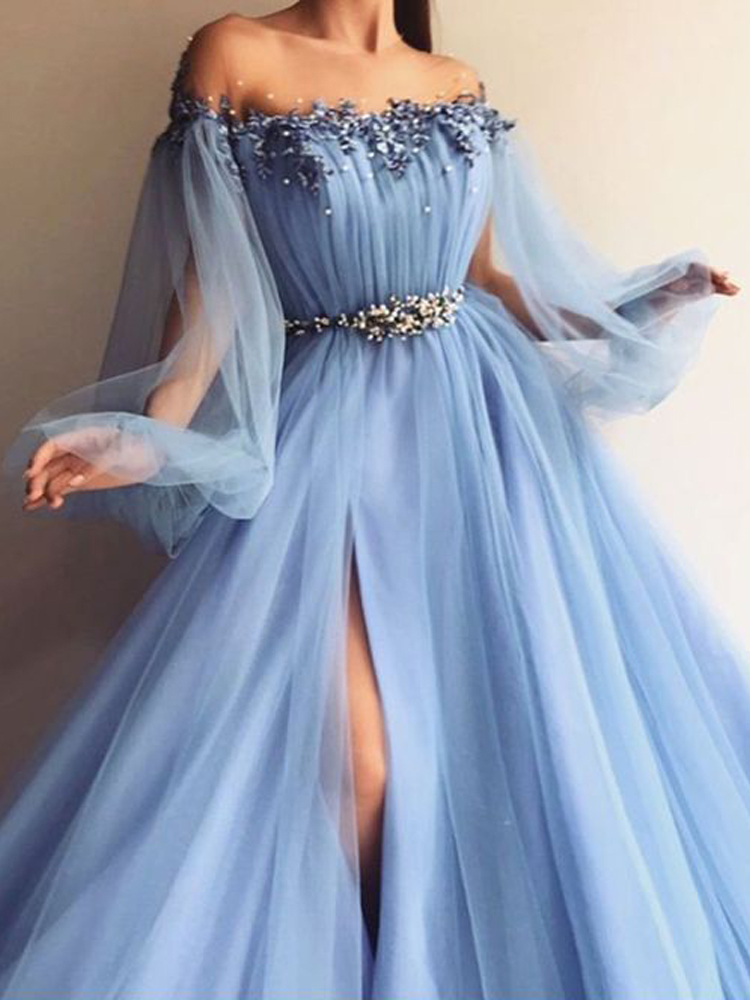 Gorgeous Ball Gown Long Sleeves Blue Split Prom Dresses with Beading Appliques