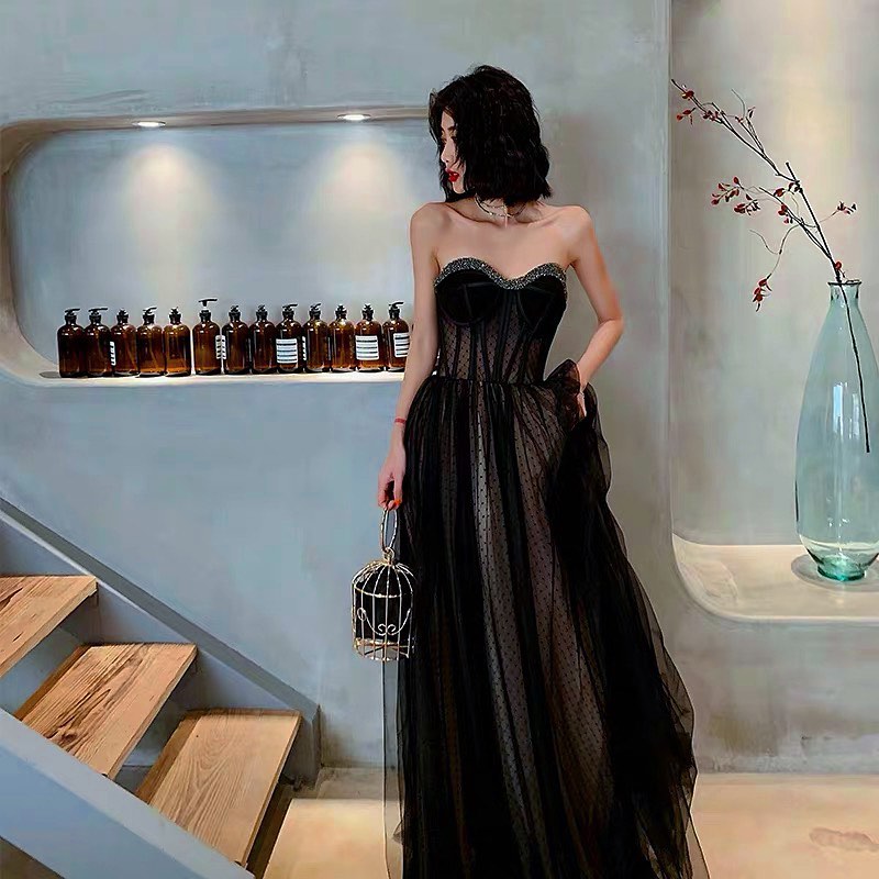 Cute A Line Sweetheart Black Dot Tulle Prom Dresses with Beading