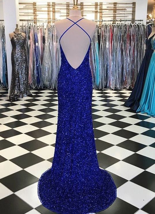 Sparkly Mermaid V Neck Straps Sequins Royal Blue Prom Dresses with Split