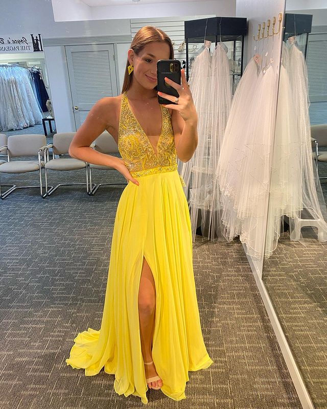Cute A Line V Neck Straps Yellow Chiffon Prom Dresses with Beading, Split Party Dresses