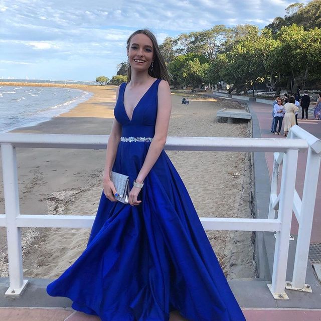 Elegant A-Line V Neck Royal Blue Satin Long Prom Dresses