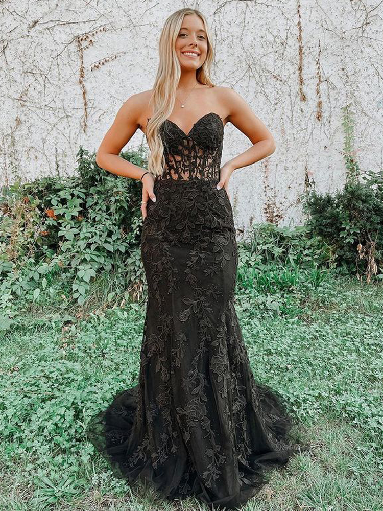 Cute Mermaid Sweetheart Black Lace Prom Dresses for 2022