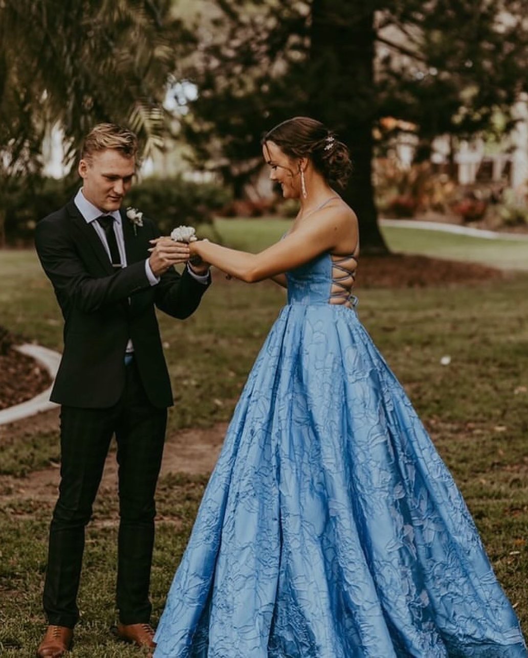 Cute Ball Gown V Neck Straps Blue Prom Dresses with Pockets