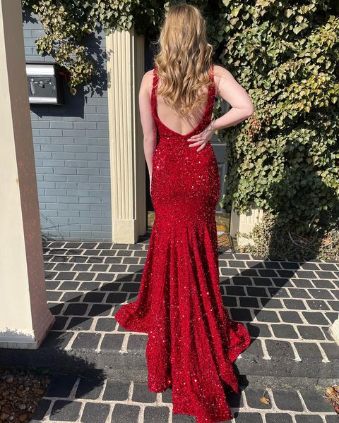 Sparkly Mermaid V Neck Red Sequins Long Prom Dresses