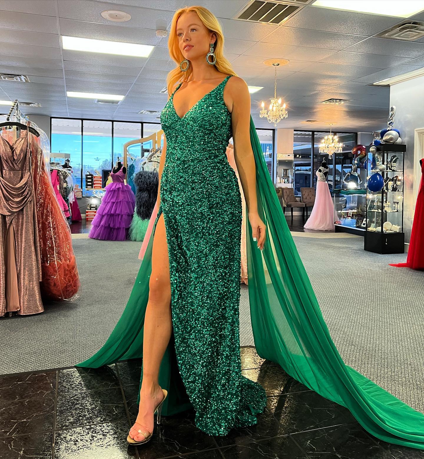 Stunning Mermaid V Neck Dark Green Sequins Long Prom Evening Dresses with Slit