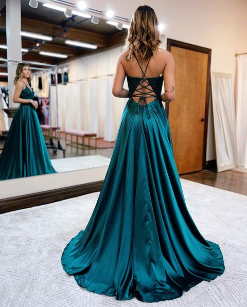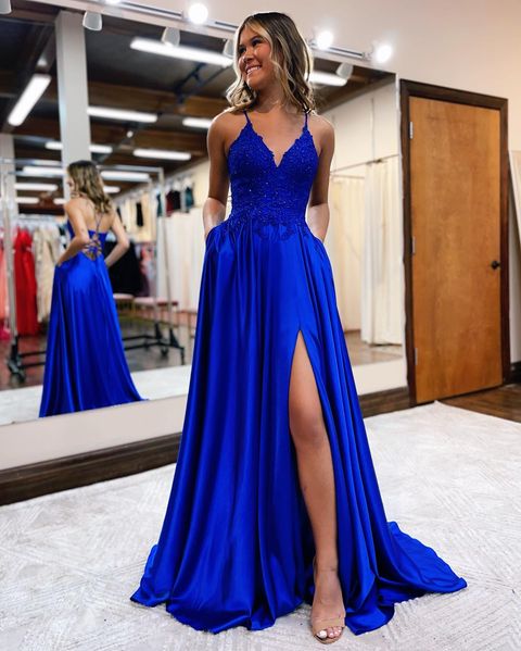 Cute A Line V Neck Cross Back Satin Prom Dress with Appliques, Slit Evening Party Dresses