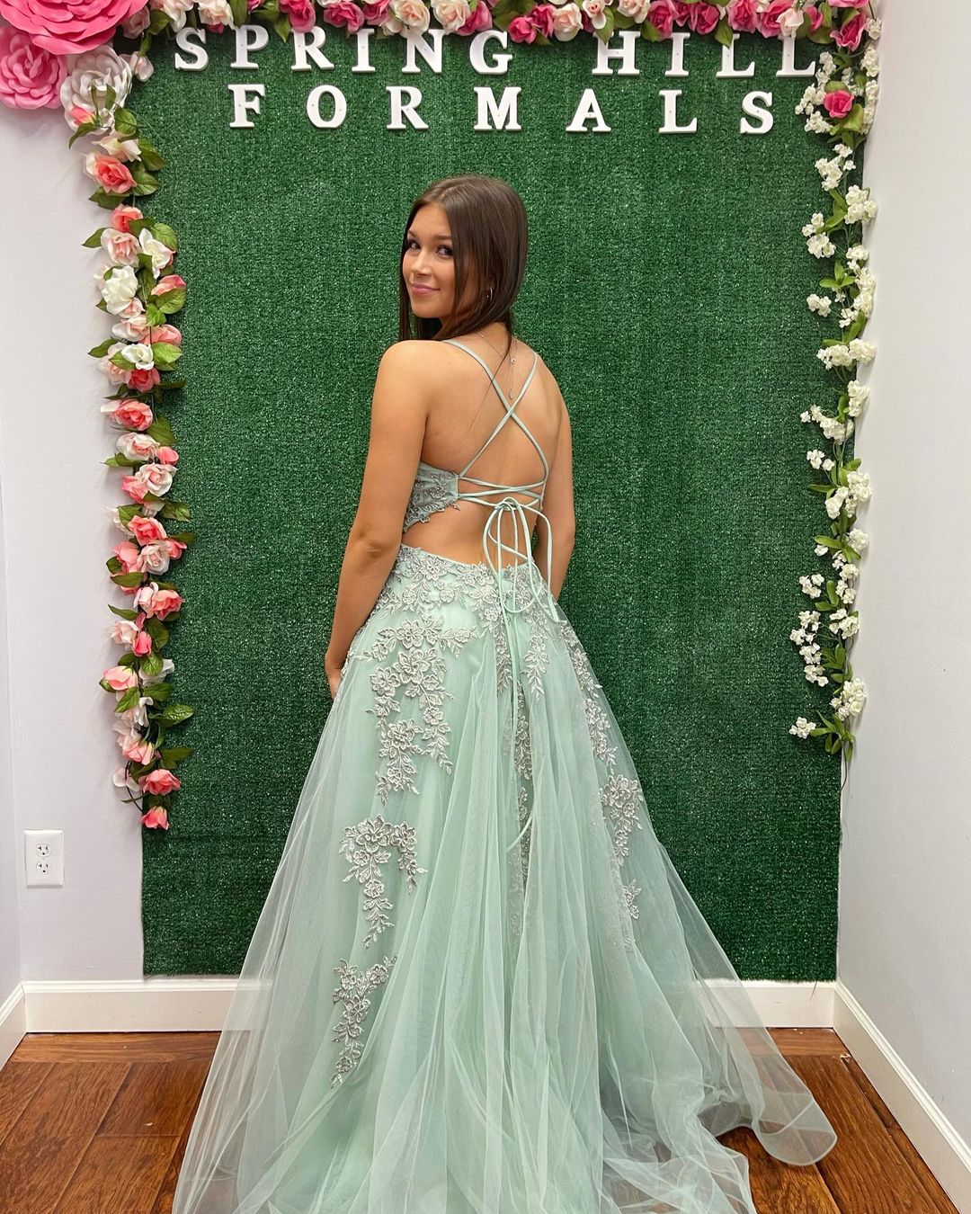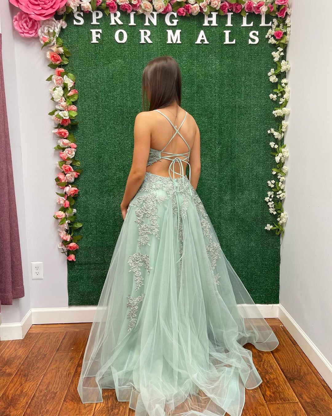 Cute A Line V Neck Sage Green Prom Dresses with Lace