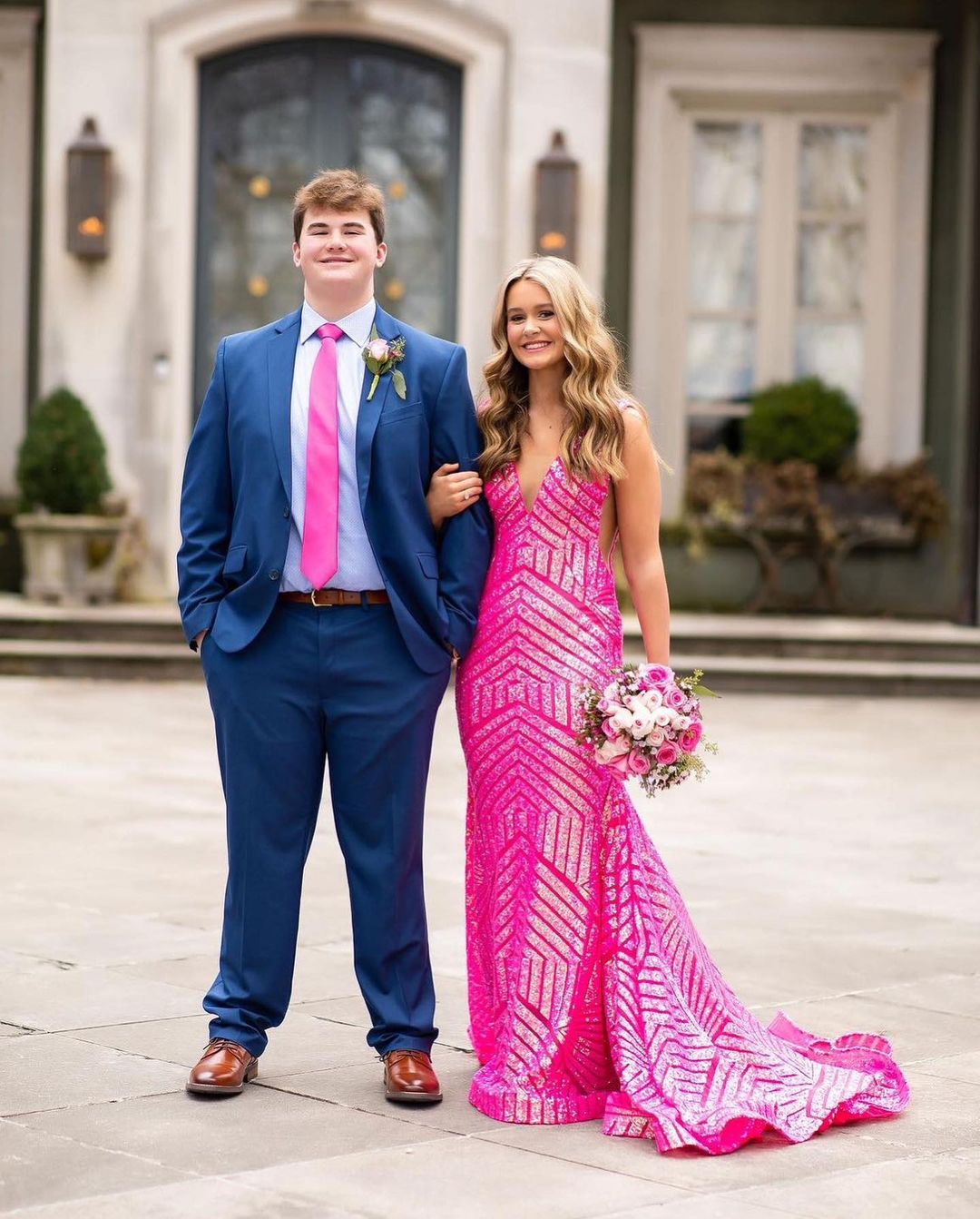 Cute Mermaid V Neck Hot Pink Sequins Prom Dresses
