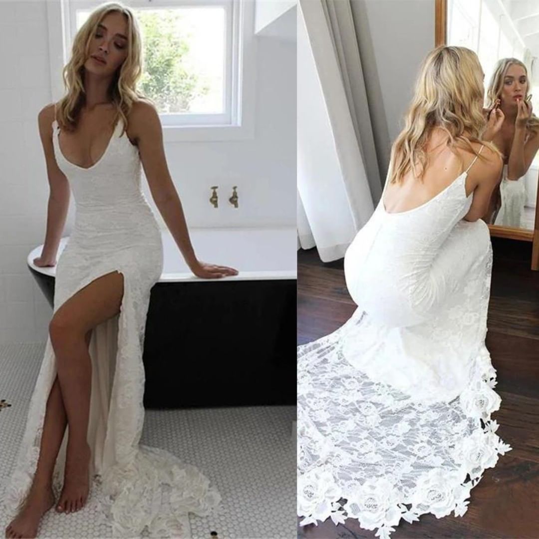 Gorgeous Straps White Lace Long Wedding Dress with Slit
