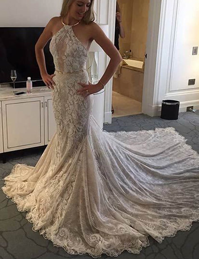 Elegant Halter Sleeveless Mermaid Court Train Lace Wedding Dress with Sash