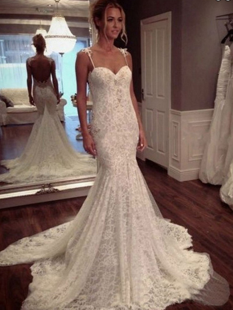 Spaghetti Straps Backless Court Train Mermaid Wedding Dress with Appliques