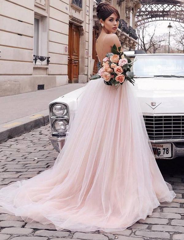 Champagne Deep V-Neck Backless Wedding Dress with Appliques