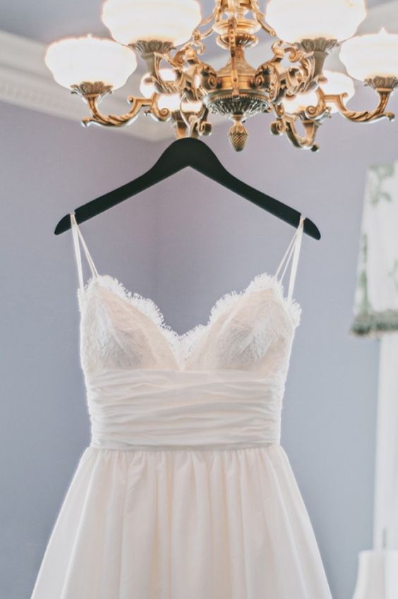 Gorgeous Ball Gown V Neck Spaghetti Straps White Satin Wedding Dress with Applique, Waist Pleat Wedding Dress