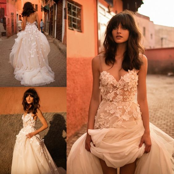 Cute Fairy A Line V Neck Spaghetti Straps Backless Ivory Tulle Wedding Dress with Applique,2018 New Beach Wedding Dress
