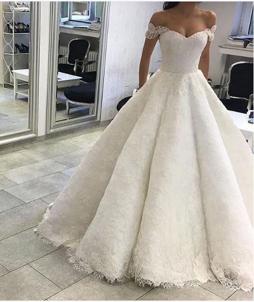 Romantic Ball Gown Off the Shoulder White Lace Wedding Dresses,Bridal Gown 2019