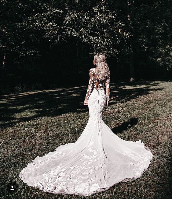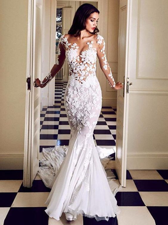 Elegant Mermaid Scoop Neck Ivory Wedding Dresses with Appliques,Long Sleeves Wedding Gowns