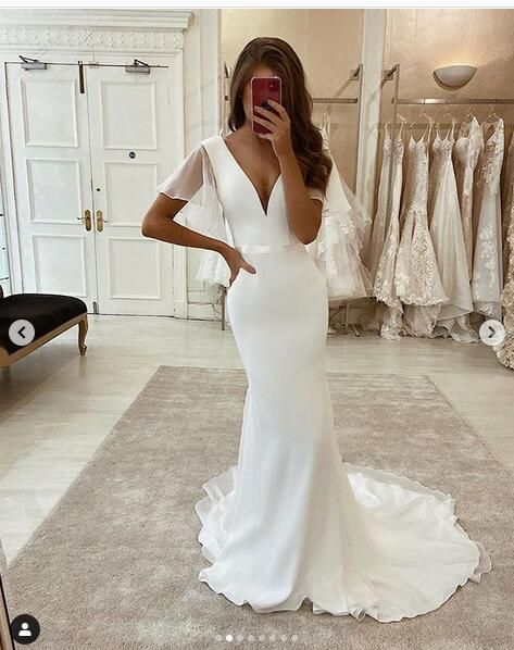 Elegant Simple Mermaid V Neck White Satin Half Sleeves Wedding Dresses