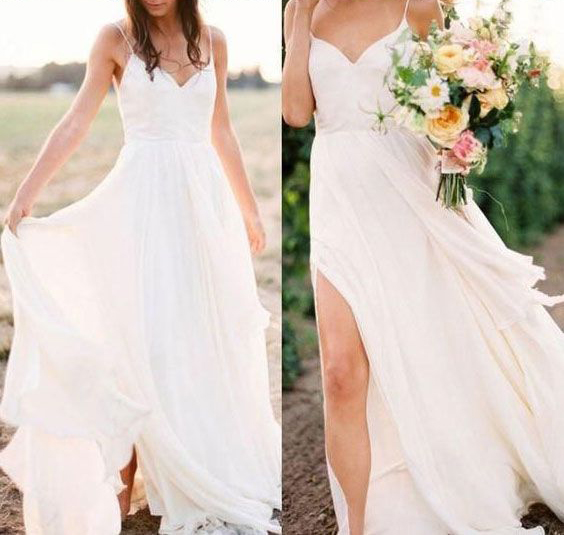 Simple A Line V Neck Spaghetti Straps White Chiffon Long Wedding Dresses with Split