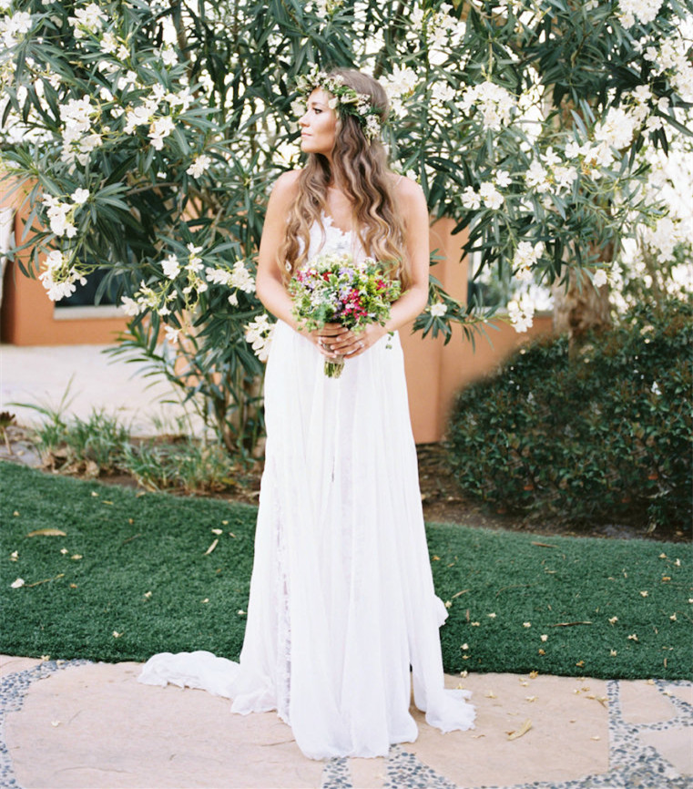 Bohemian Sheath V Neck Spaghetti Straps White Lace Long Wedding Dresses with Split