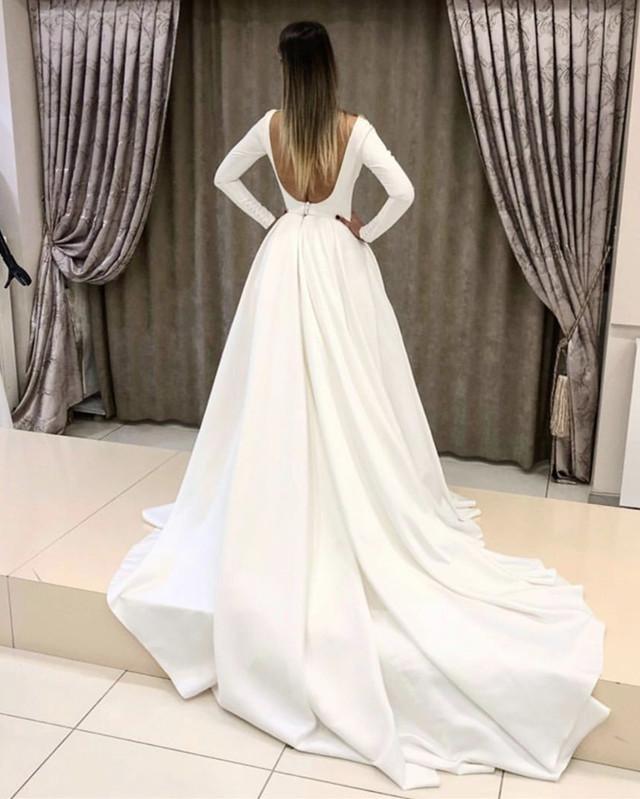 Retro Ball Gown Round Neck Long Sleeves White Satin Wedding Dresses