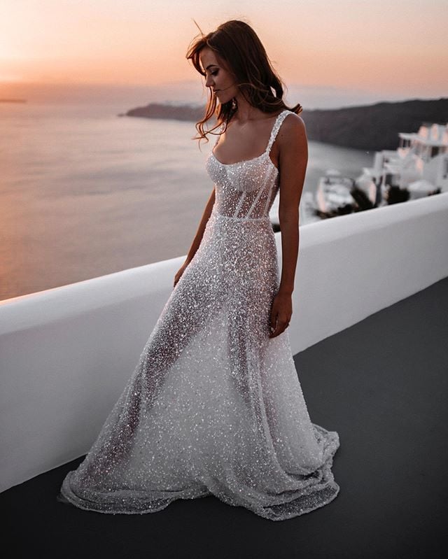 2021 New Fashion Sparkly A Line Scoop Neck Sequins Wedding Dress Beach Wedding Dress