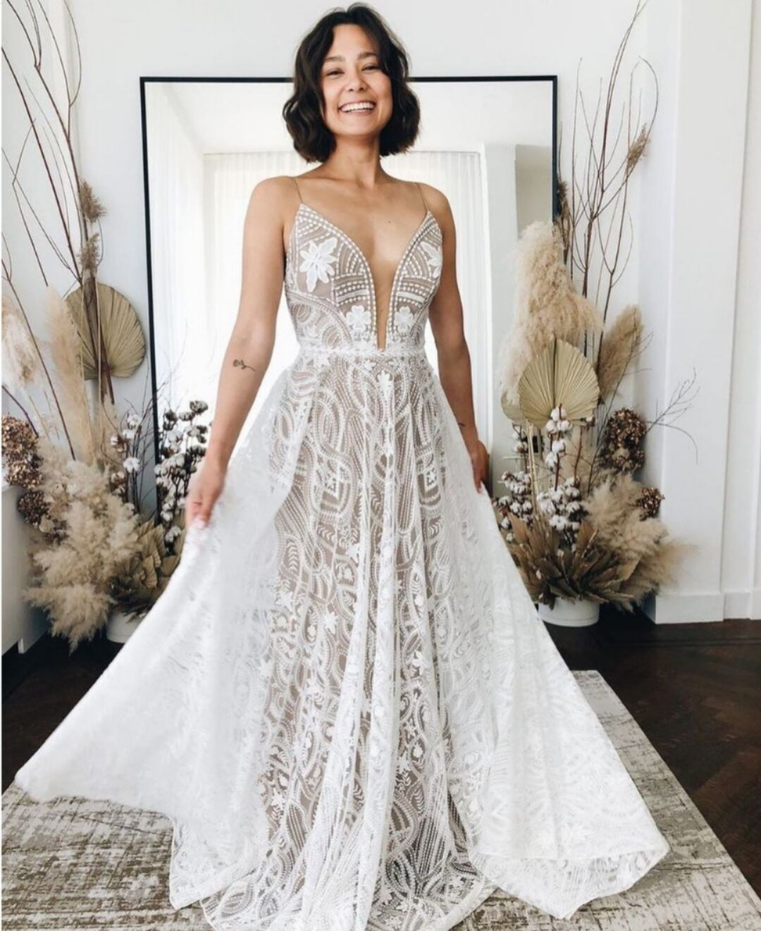 Bohemian A Line V Neck Straps White Lace Wedding Dresses, 2021 Fashion Beach Wedding Dress